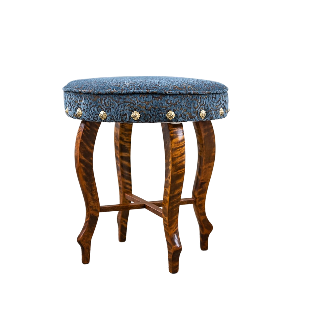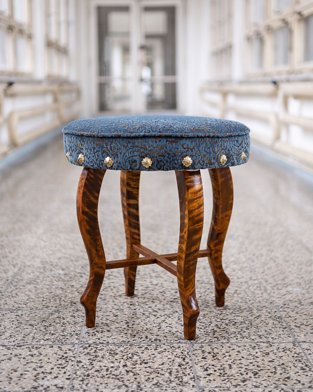 Elegantní taburet s extravagantními nohami z exotického dřeva. Povrch je ošetřen tradiční šelakovou politurou v lesku, která zvýrazňuje kresbu dřeva.