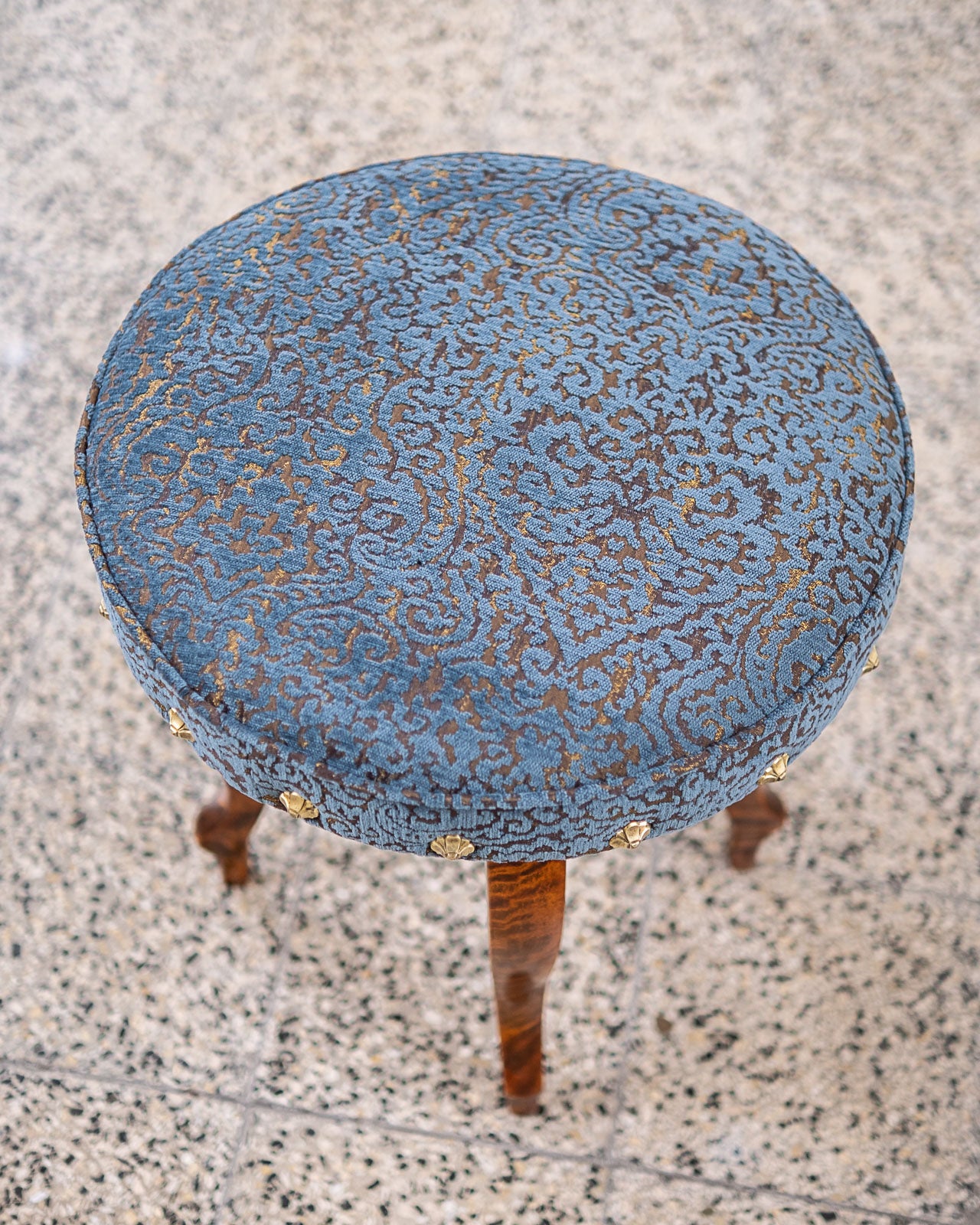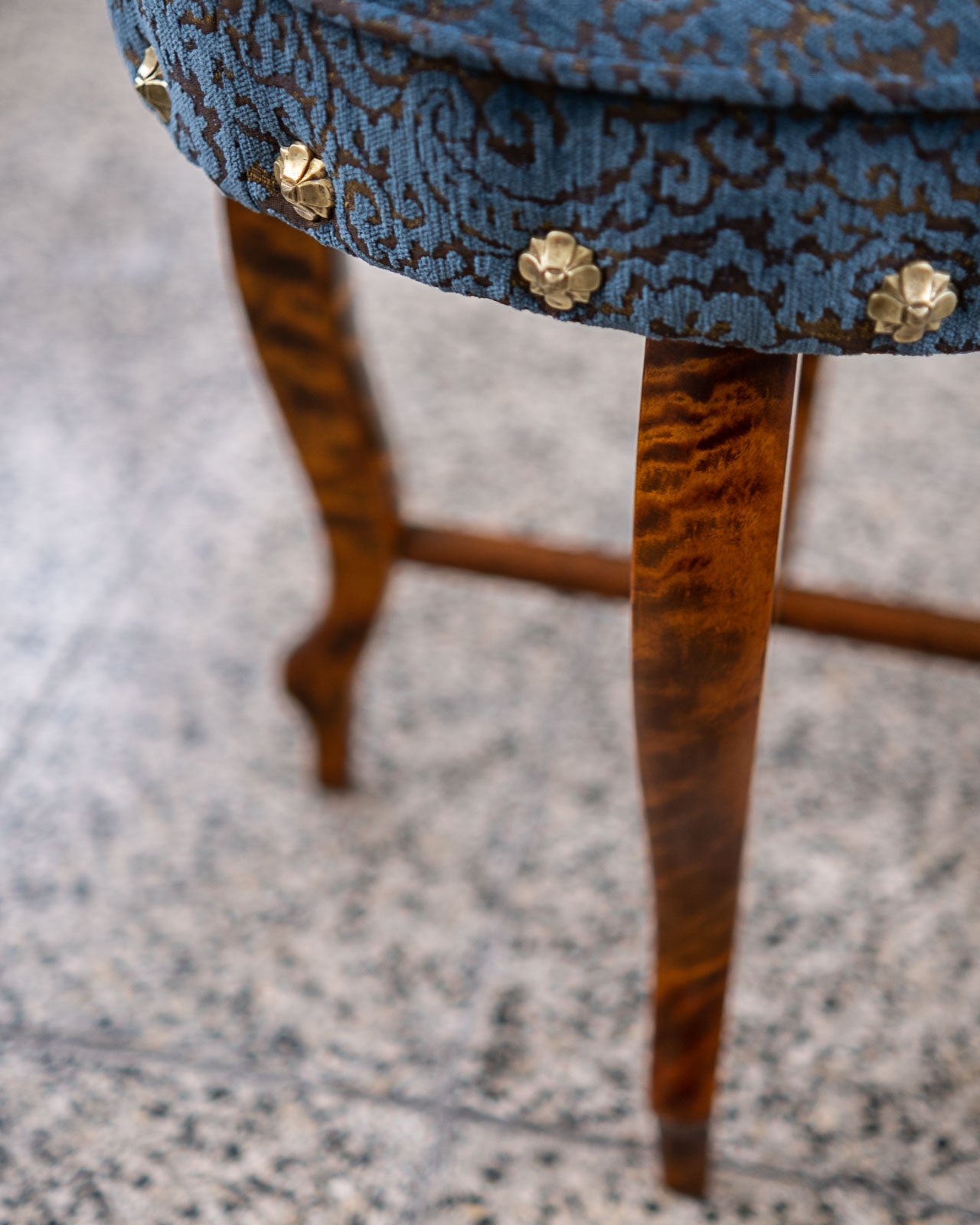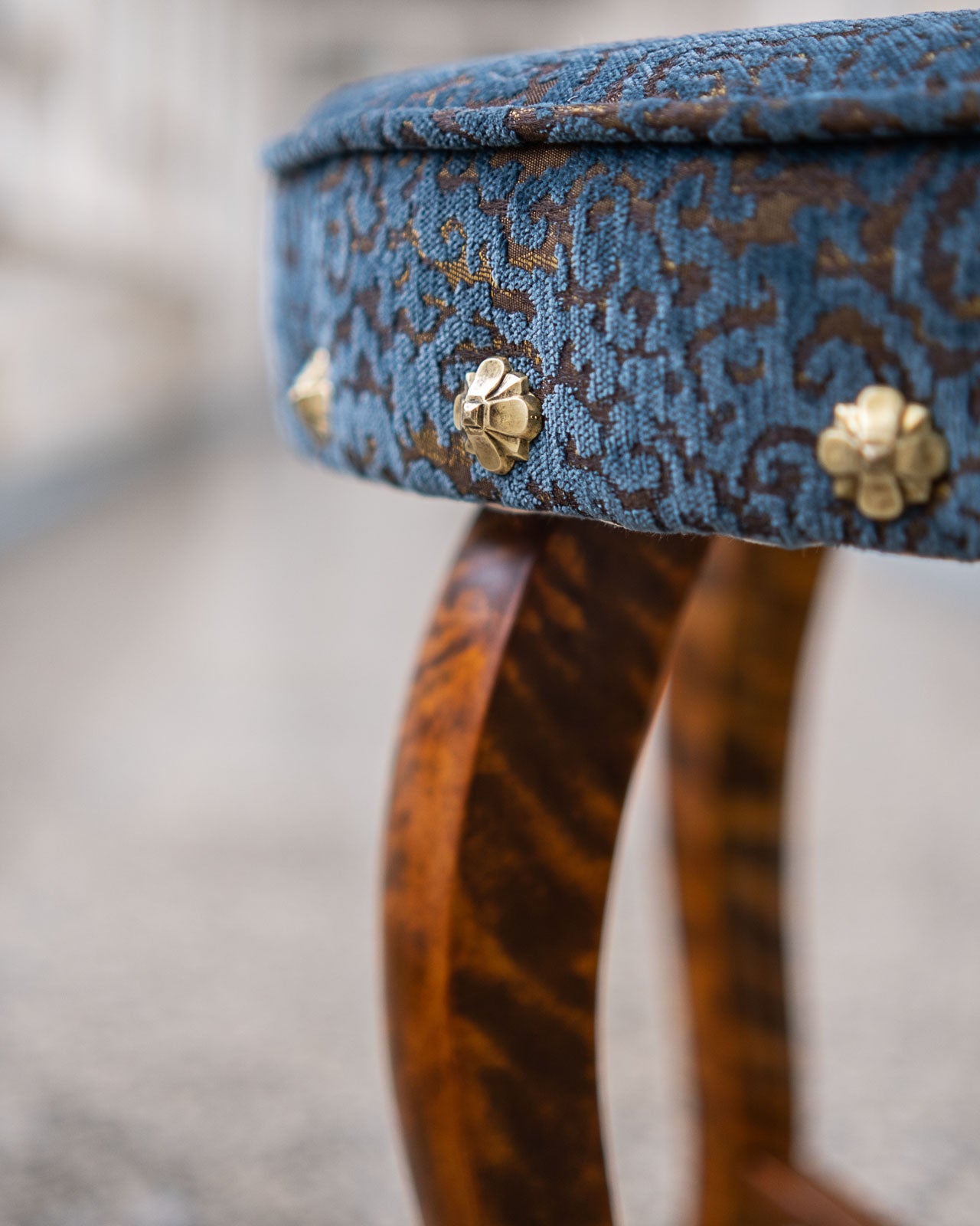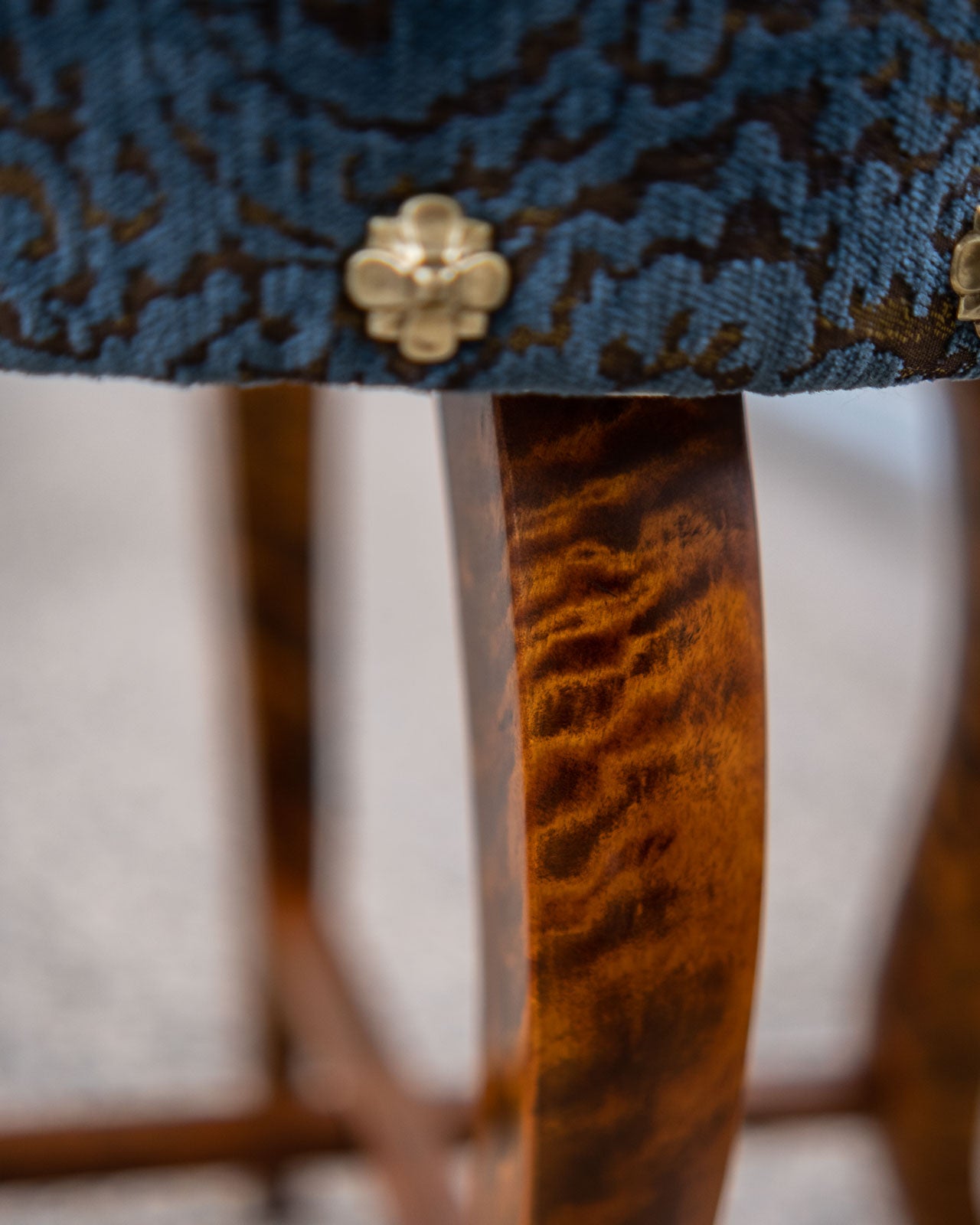 Sedák prošel kompletní renovací – nově je vyplněn PUR pěnou a rounem, potažen modrou potahovou látkou s jemným vzorem. Původní mosazné hřeby podtrhují historický charakter a řemeslné zpracování.